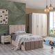 Dormitorul Mona este o propunere elegantă și rafinată pentru un spațiu de odihnă modern. Patul tapițat în material bouclé, cu tăblie capitonată și rotunjită, aduce un plus de confort vizual și tactil, în timp ce mobilierul în nuanțe calde de lemn natur contribuie la o atmosferă relaxantă. Comoda și noptierele cu design simplu și funcțional oferă spațiu generos pentru depozitare, iar dulapul cu uși glisante și compartimentare inteligentă completează perfect ansamblul. Detaliile decorative naturale, lumina caldă și liniile curate ale pieselor de mobilier transformă acest dormitor într-un refugiu plin de stil și echilibru.